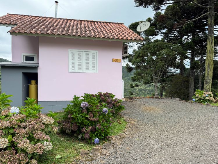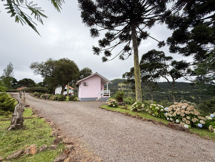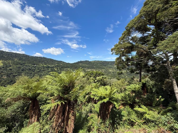 A vista se estende pelo vale da serra catarinense, convidando a desacelerar e aproveitar o silêncio e a natureza ao redor.